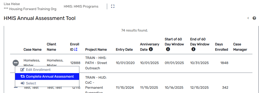 7. By selecting the action dots, you will see options to Edit the Enrollment, Complete the Annual Assessment, or choose Select to view the neighbor’s Dashboard.